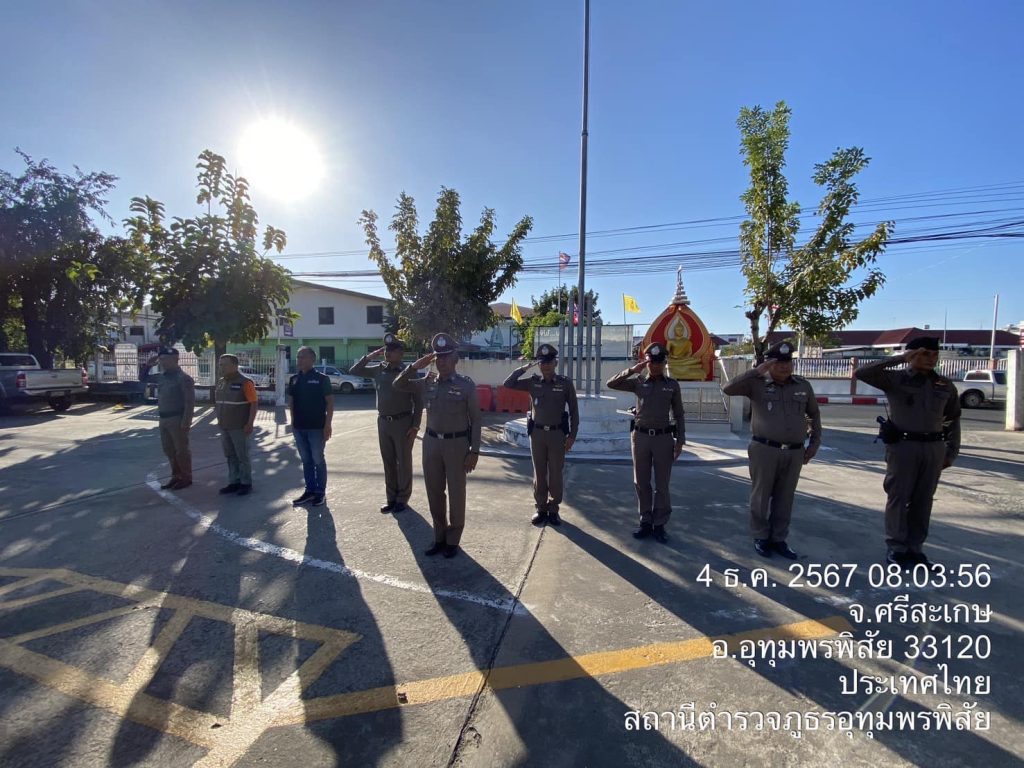 พ.ต.อ.นิลกาฬ พรศักดิ์ ผกก.สภ.อุทุมพรพิสัย , พ.ต.ท.สงวน เรืองฝาง รอง ผกก.ป.ฯ , พ.ต.ท. กิตติศักดิ์ คำเครื่อง รอง ผกก.(สอบสวน)ฯ , พ.ต.ท.พัฒพงษ์ ค่ำคูณ รอง ผกก.สส.ฯ นำข้าราชการตำรวจในสังกัด เข้าแถวเคารพธงชาติ กล่าวคำปฏิญาณ สวดมนต์ไหว้พระ กล่าวบทปลงใจตำรวจ มอบภารกิจ ตามข้อสั่งการชี้แจงข้อราชการ ดังนี้