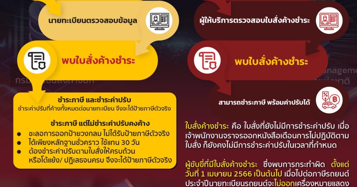 ผู้ขับขี่ที่มีใบสั่งค้างชำระ ซึ่งพบการกระทำผิด ตั้งแต่วันที่ 1 เมษายน 2566 เป็นต้นไป ( ไม่มีผลย้อนหลัง ) เมื่อไปต่อภาษีรถยนต์ประจำปี นายทะเบียนรถยนต์จะไม่ออกเครื่องหมายแสดงการเสียภาษีประจำปี หรือ ป้ายภาษี ให้