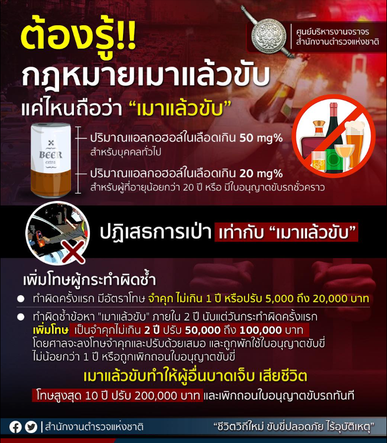 • แค่ไหนถือว่า “เมาแล้วขับ” ?– ปริมาณแอลกอฮอล์ในเลือดเกิน 50 mg% ( สำหรับบุคคลทั่วไป )–