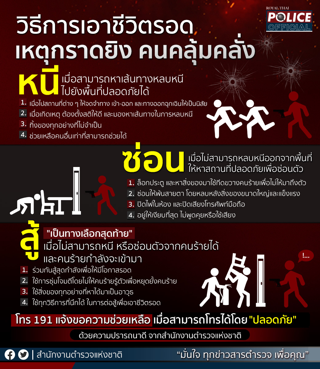 รู้ไว้!! วิธีการเอาชีวิตรอด จากเหตุกราดยิง หรือ คนคลุ้มคลั่ง สำนักงานตำรวจแห่งชาติ ประชาสัมพันธ์ให้ป